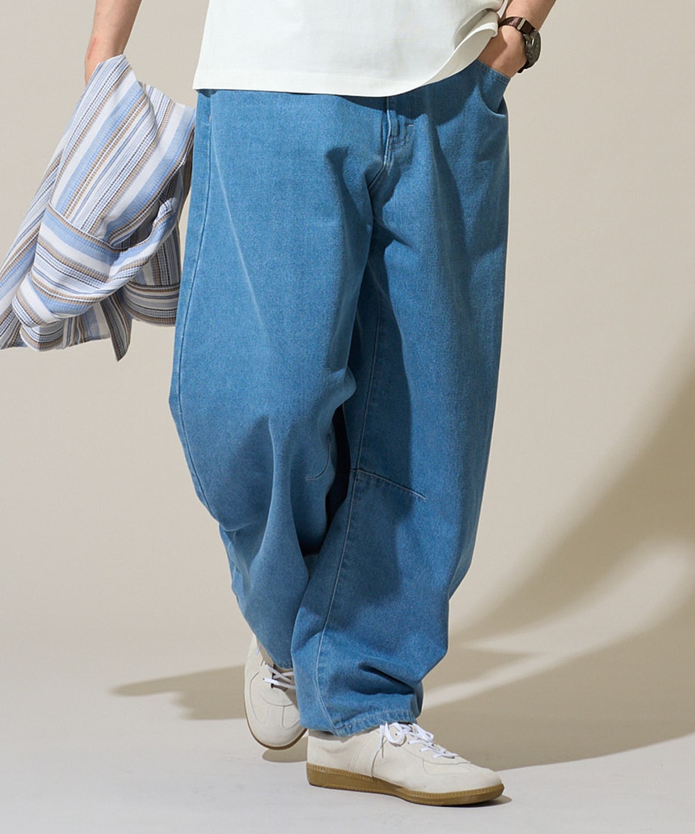 メンズのワイドデニムは、スカーフをベルト代わりに結び、リラックス感とおしゃれ感を両立。