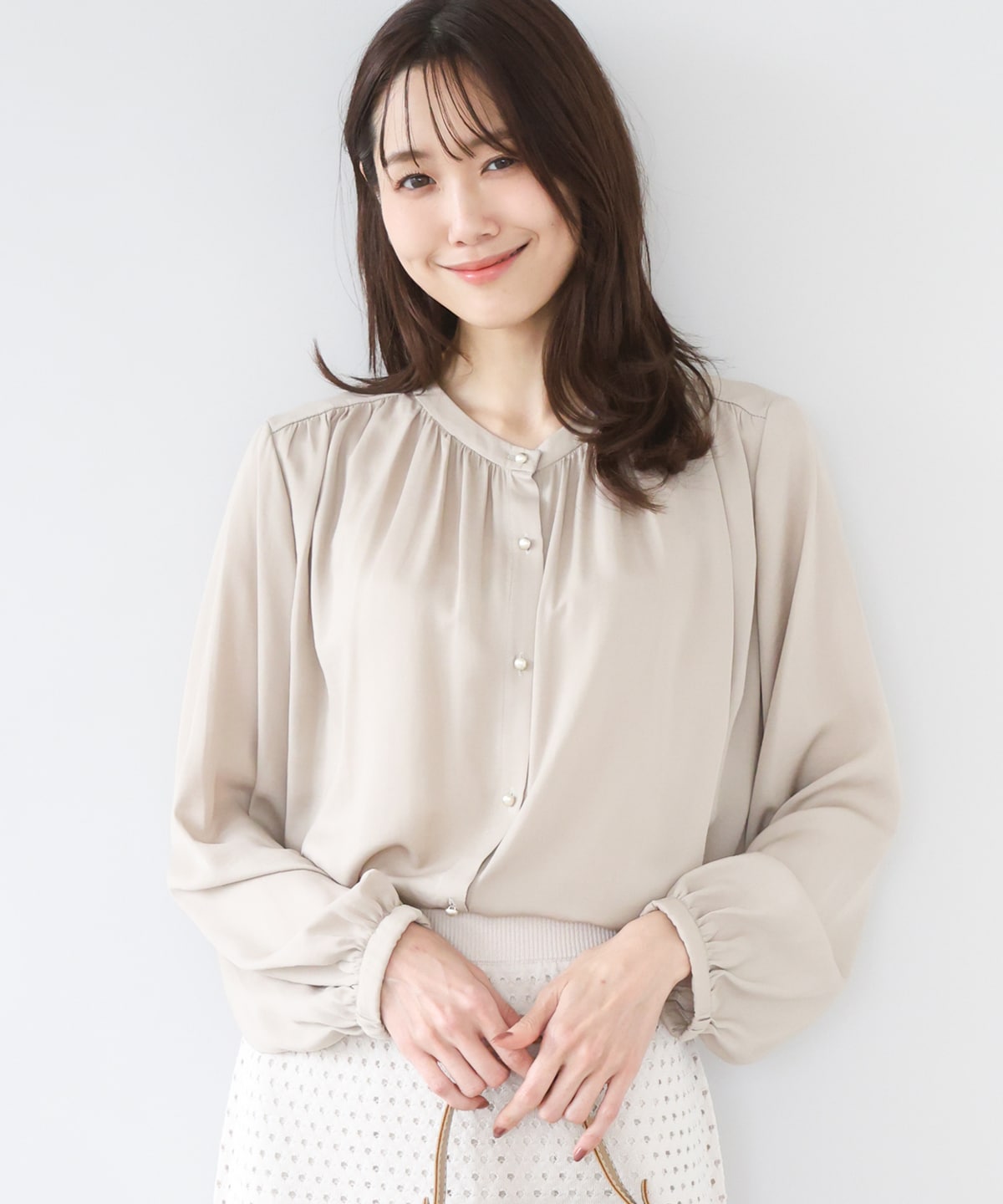 [UVカット/接触冷感/洗える]バンドカラーサテンブラウス