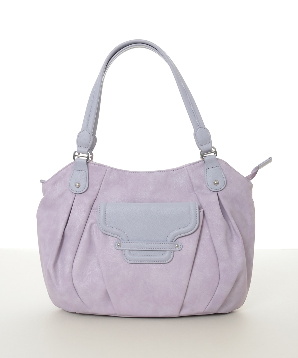 きれいなカラーのトートバッグ。質感の異なるレザー調生地をパーツ使いしたフロントのフラップポケットがお洒落なポイントです。ショルダーストラップ付きでシーンに合わせて使い勝手の良いバッグです。