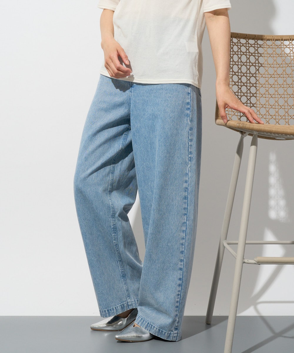 イージーデニムワイドパンツは、ブリーチ加工や薄染めで仕上げたややゆとりのあるシルエットが、リラックスしたカジュアルスタイルにぴったりです。着丈長めです。