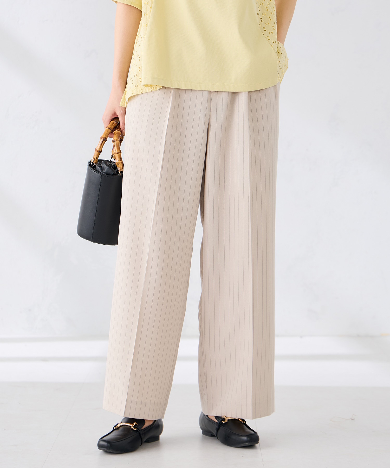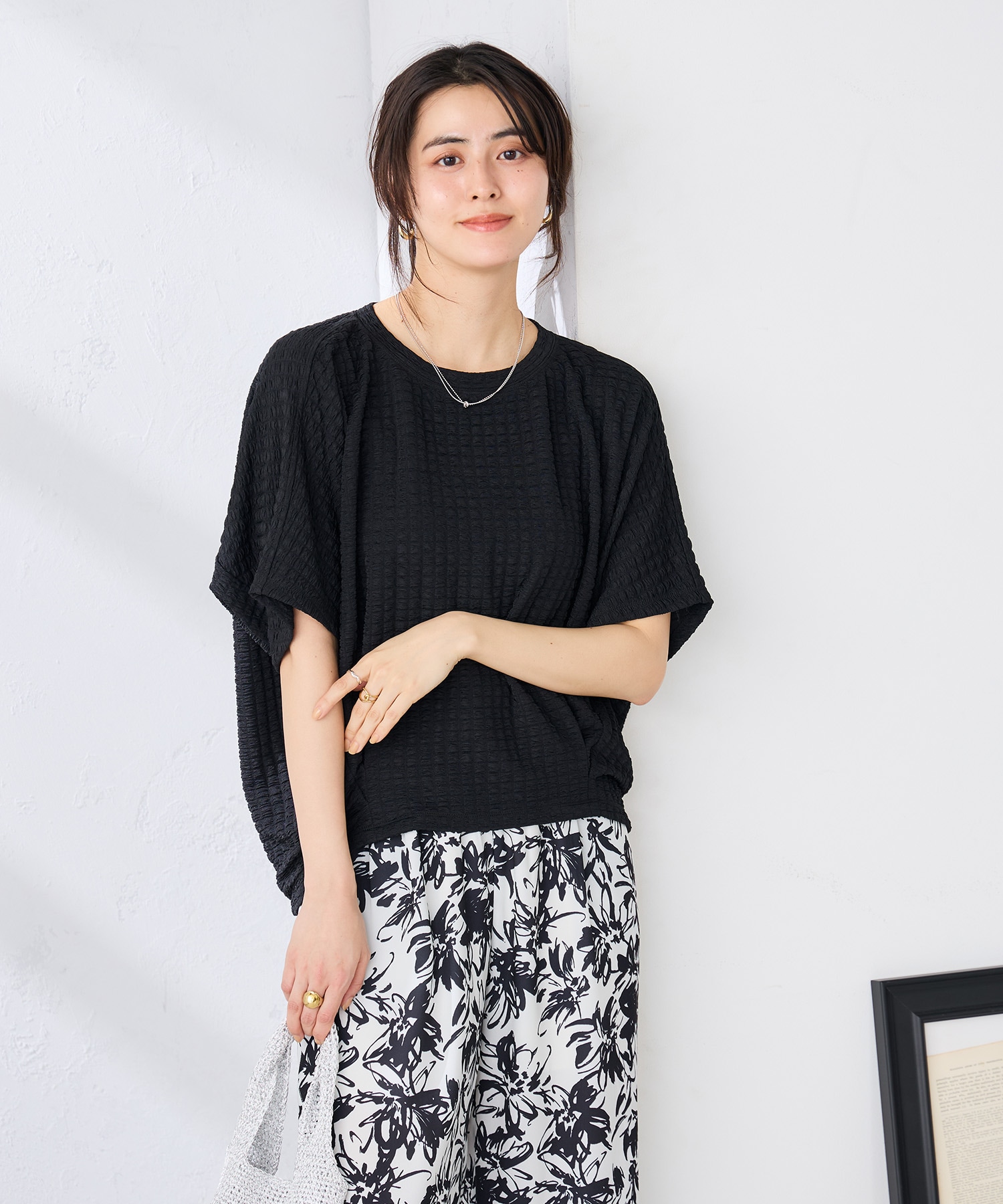 ポコポコカットソーとの相性も良く、体型カバーやスラっと脚長見えを叶えるワイドパンツと合わせれば、オンオフ問わずこなれ感のある大人コーデに仕上がります。
