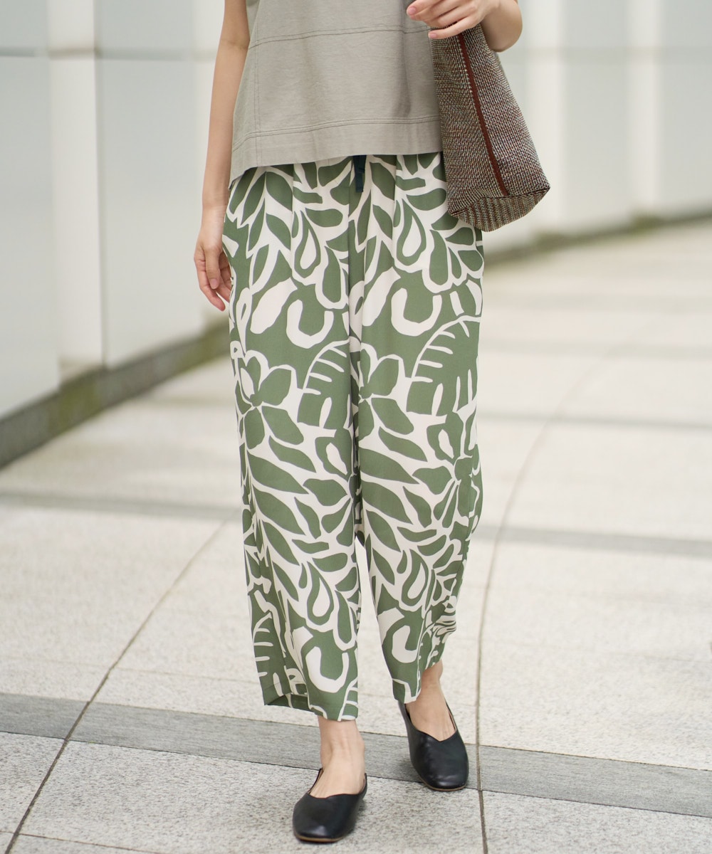 一方、ポタニカルフラワープリントパンツは、ウエストゴム仕様で穿き心地も快適。