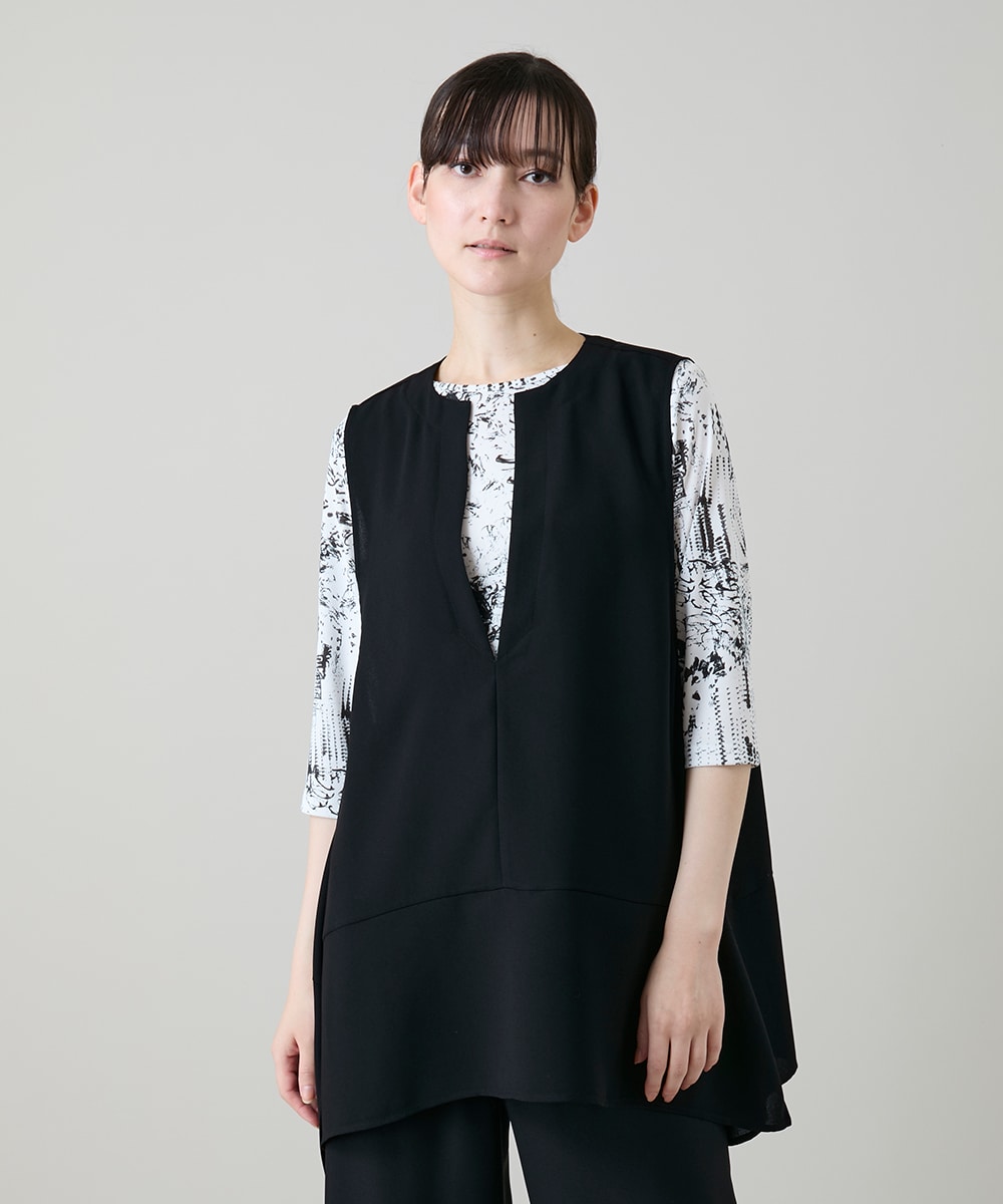 ジレは薄手ジョーゼット素材のVネックドレープジレ。ウエストから切り替えが入りサイドスリットと共に裾がゆったした綺麗なドレープが特徴です。これからの季節Tシャツやカットソー一枚の時に軽くて胸元綺麗なスッキリあきな首元からの縦強調とモード感あるスタイリッシュなジレは一枚重ね着するだけで完成度の高いコーディネートに。