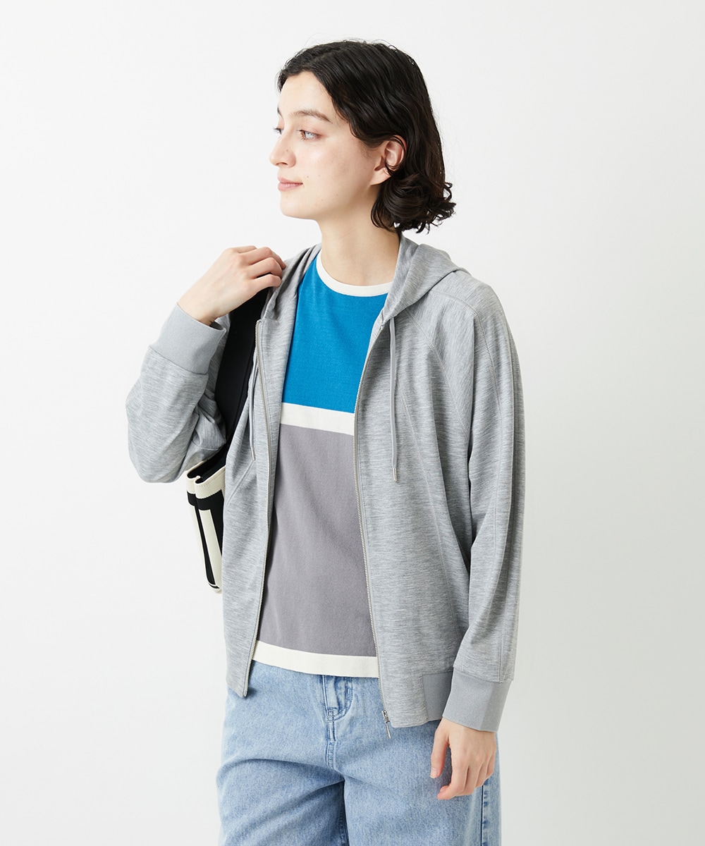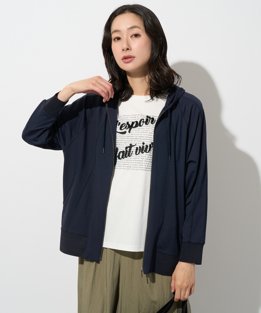 ラグランスリーブの8分袖パーカーは、放射切り替えと丁寧な仕上げが魅力で、ラフな着こなしにぴったり。