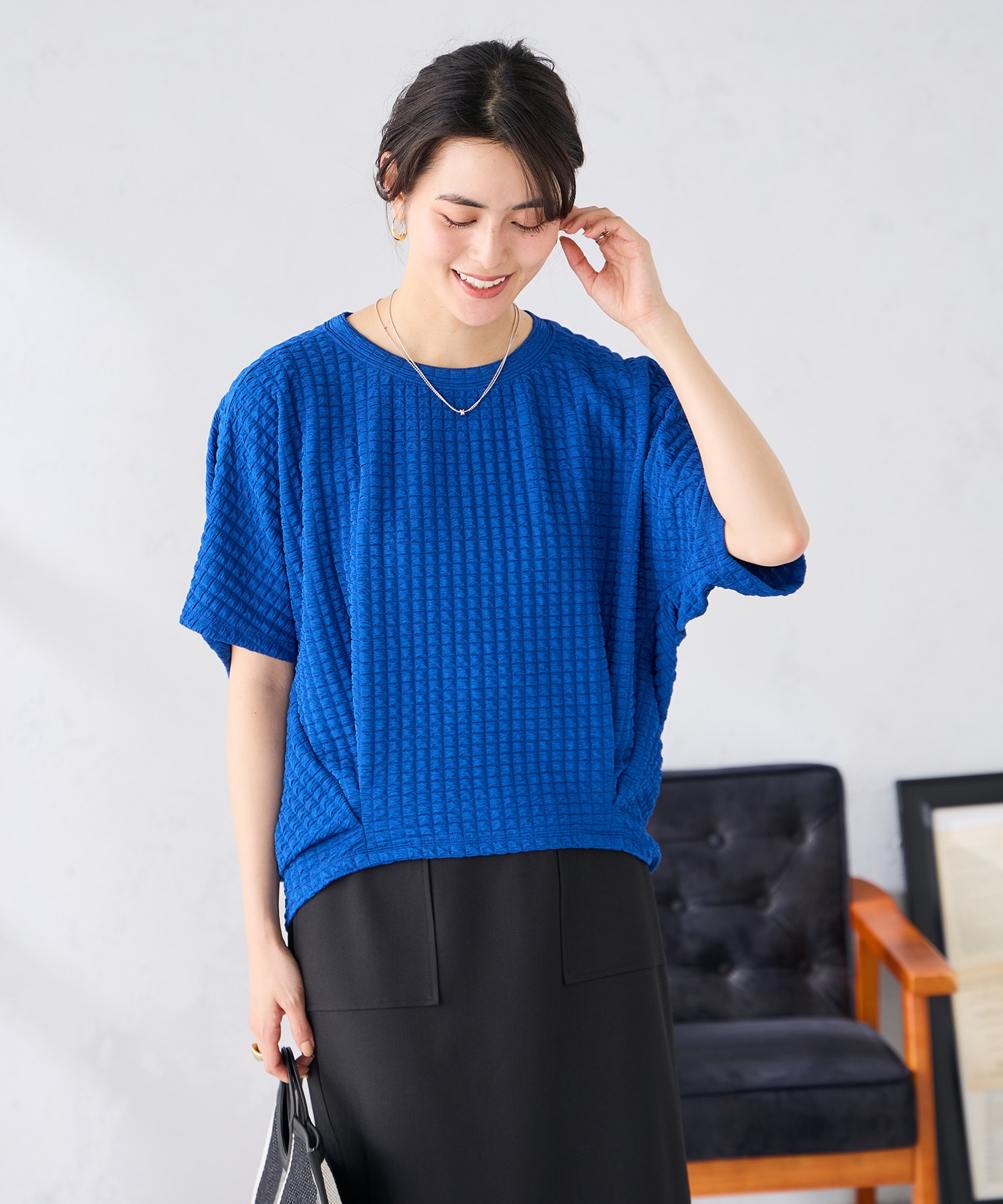 トップスは、鮮やかな青でこれからの季節にピッタリののお色味です!