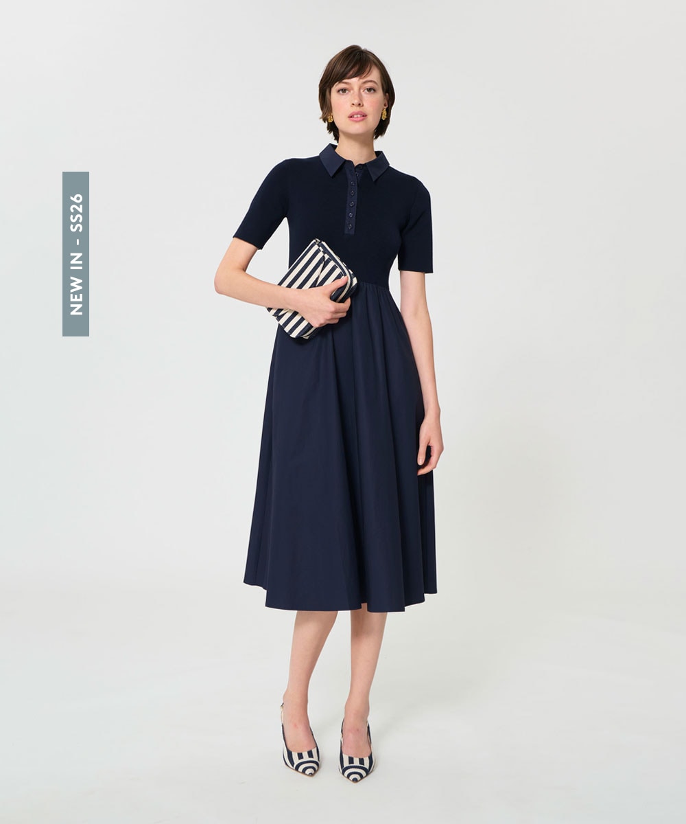 コンパクトな上半身と、布量たっぷりのフレアスカートでメリハリのあるシルエットに