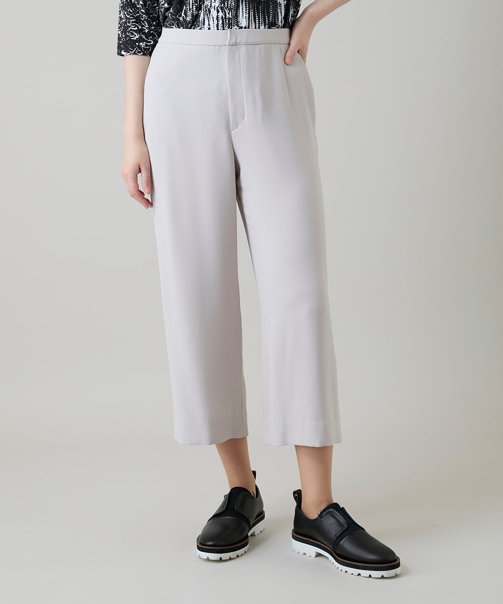 サテンジョーゼットアンクルパンツは、適度な落ち感と軽やかな丈感が特徴で、着るだけで洗練された大人コーデが完成。