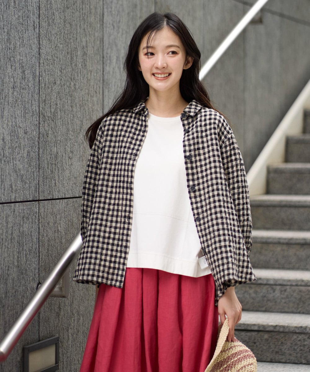 リネンコットンチェックブラウスは、ゆったりとしたドルマンスリーブとギンガムチェック柄で、カジュアルながらも上品な印象を演出。