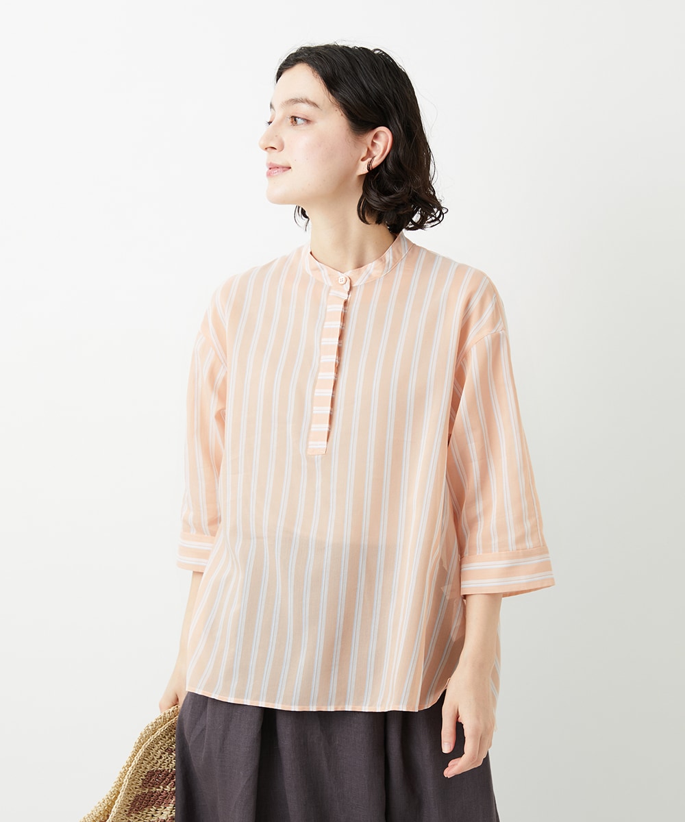 オーバーブラウスは、風通しの良いシアー素材とややワイドなシルエットで涼やかに着こなせます。ストライプ柄が爽やかなアクセントに‼︎