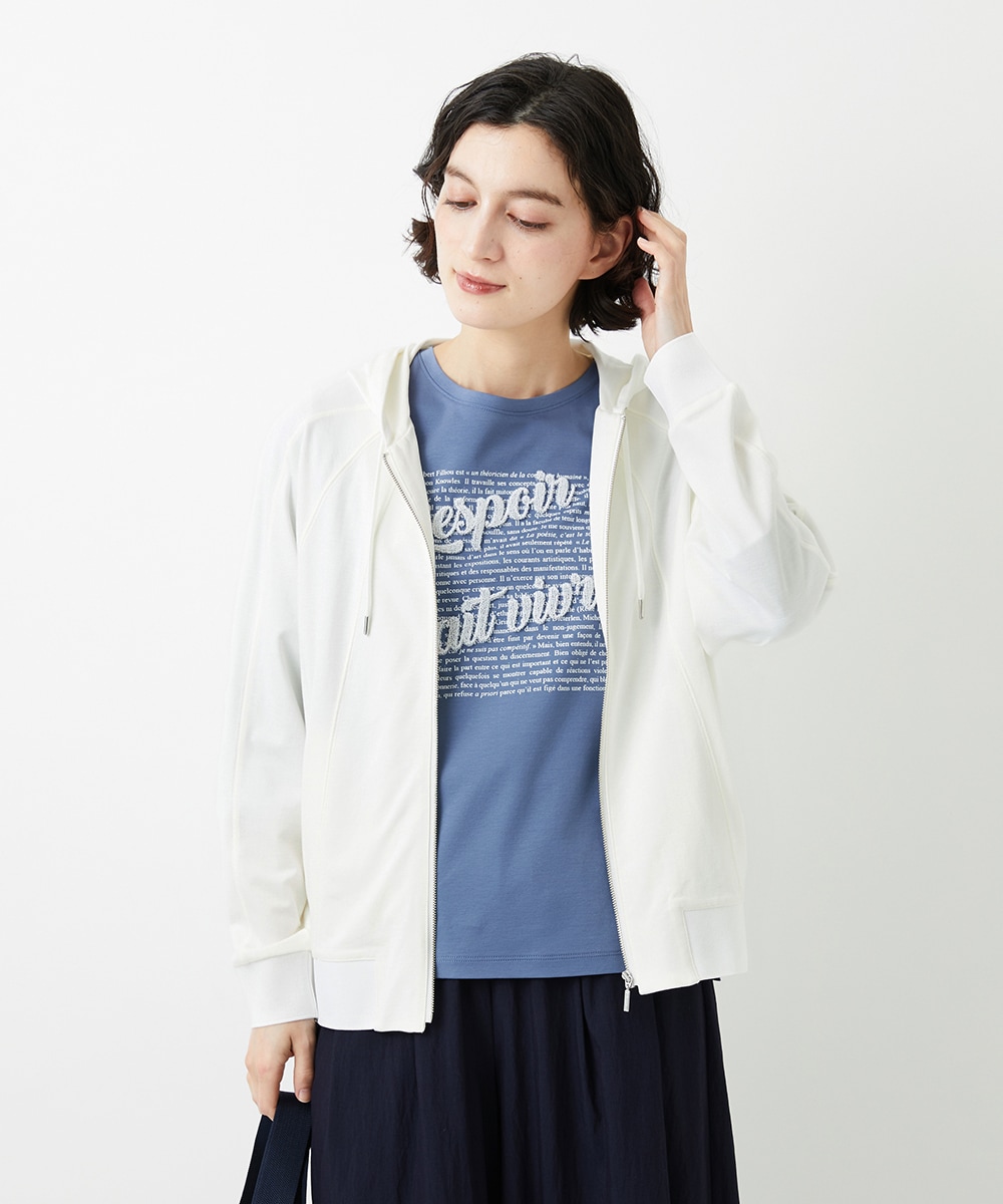 ラグランスリーブの8分袖パーカーは、放射状の切り替えと丁寧な仕立てが魅力。