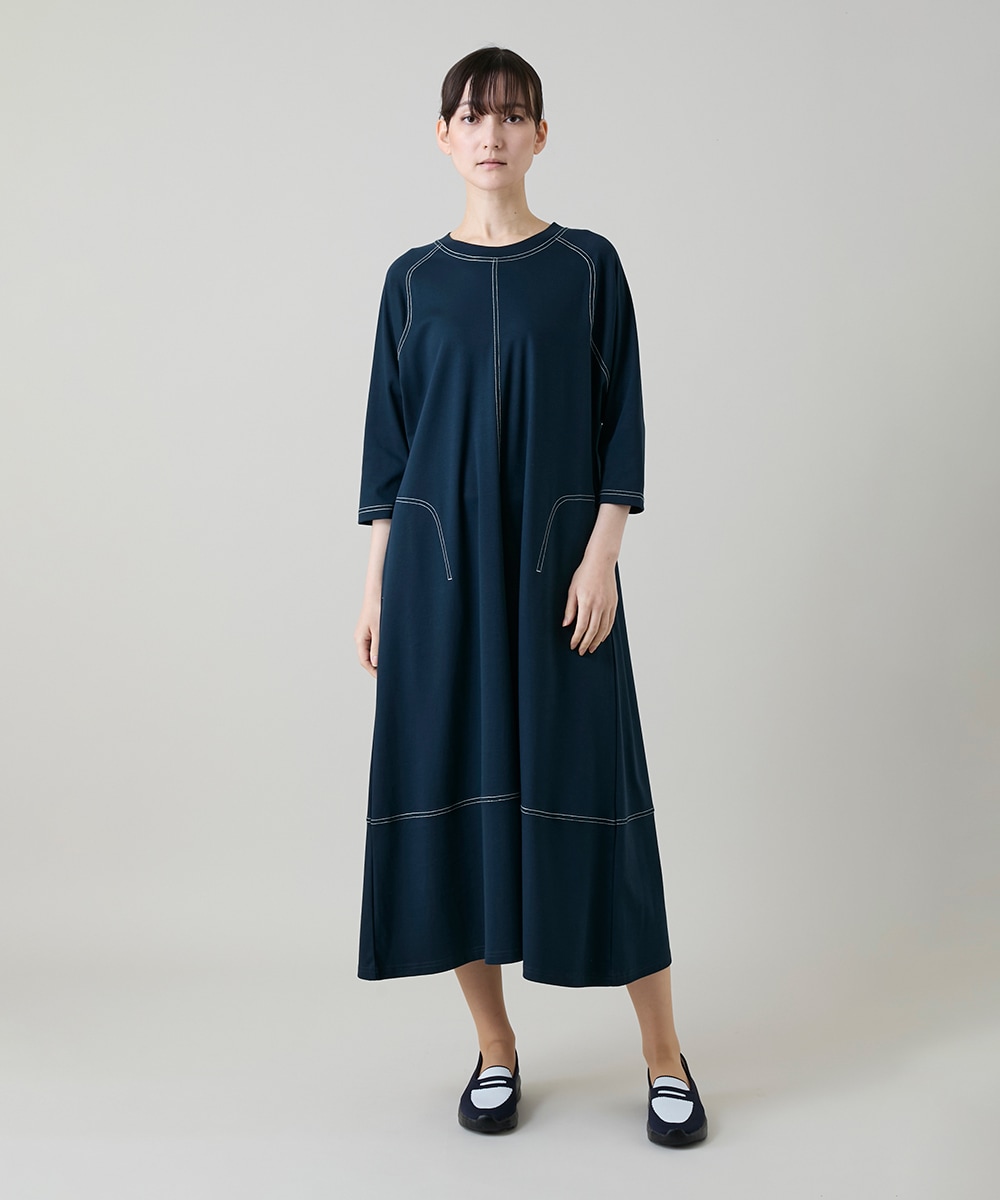 夏に嬉しいコットン素材のワンピースです。コットン100%と思えないとてもソフトな肌触りで、着心地抜群なのでストレスがなくお勧めです。ラグランスリーブで動きやすく気になる肘が隠れる7分袖が嬉しいです。白の配色ステッチがメリハリをプラスします。夏に着になる汗染みを軽減する素材なのでデイリーに楽しめます。