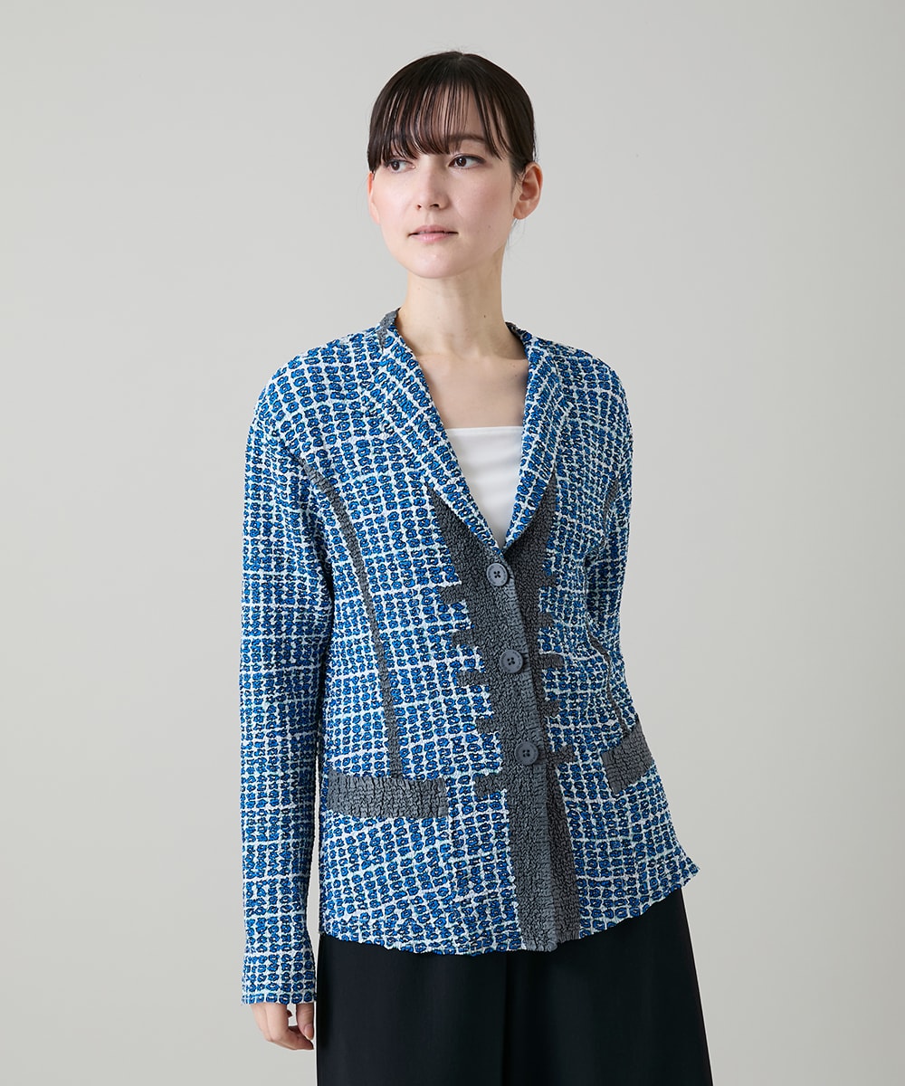 カーディガンは立体プリーツで作られたジャケット風なカーディガン。ポリエステルプリーツの立体的な表情が素敵な軽くて伸びやかでシーズンレスなアイテムとして活躍します。前縦のように入った配色やラインがアクセント
