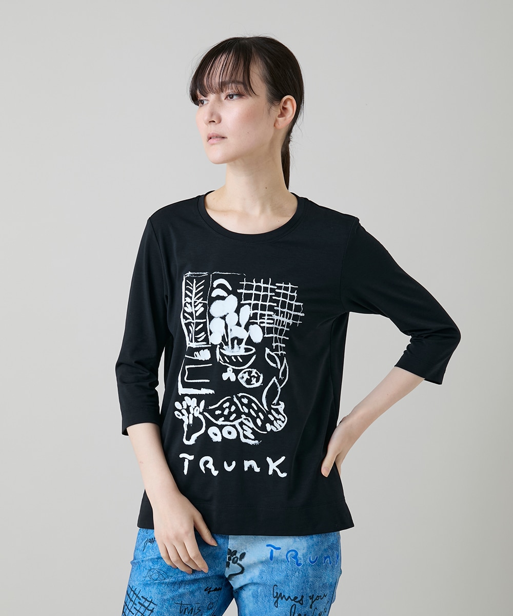 カットソーはコットン七分袖。モノトーン配色でインナーとしても一枚着としても体系拾いにくいシルエット。3色ともあわせるカラーリングが別なので色違いで持っておくとコーデの幅が広がります