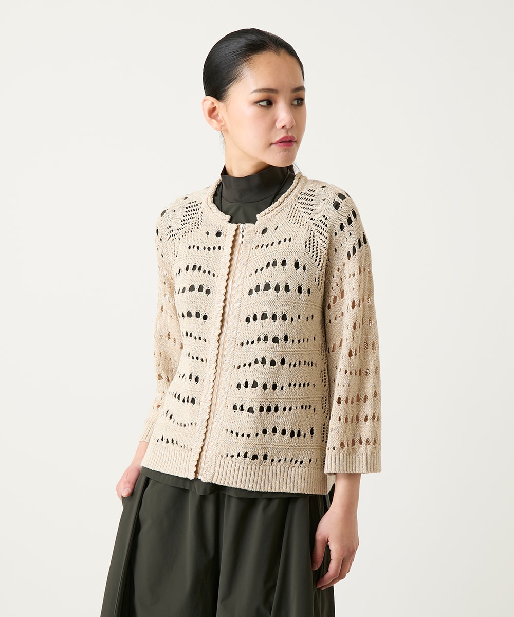 トップスにゴールドラメのニットを合わせることで初夏に向けてのコーディネートに仕上げました。