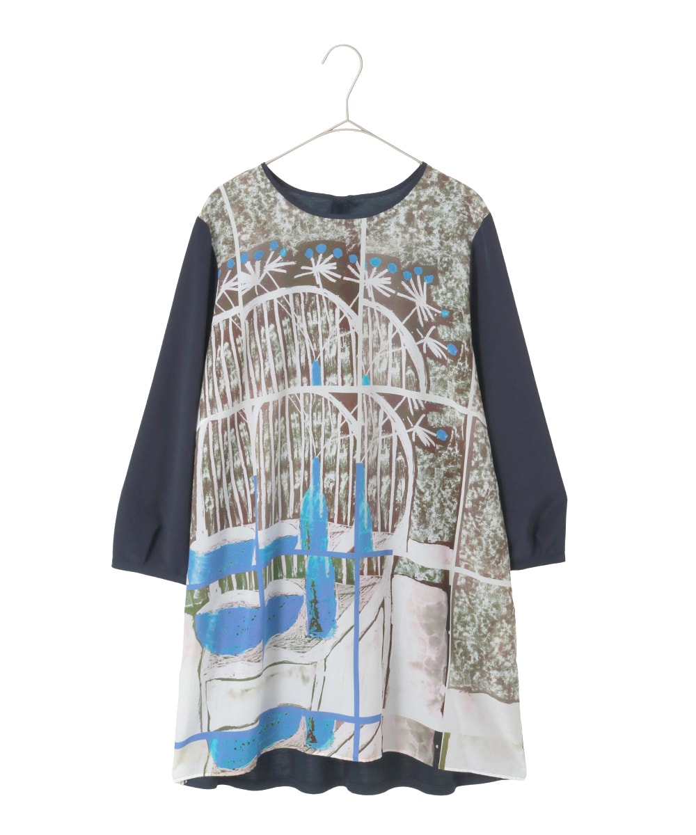 ブルーボトルをアクセントにした目を惹くプリントのチュニックです。