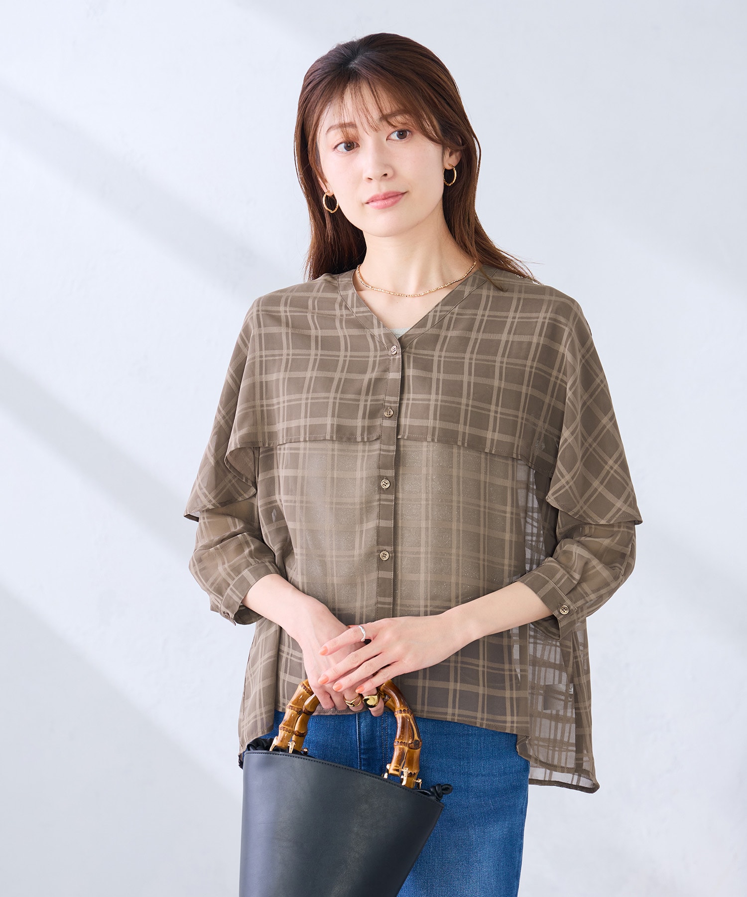 シアー素材が涼しげな、上品に着映えるデザインブラウスはSサイズ着用でゆったりタイプです