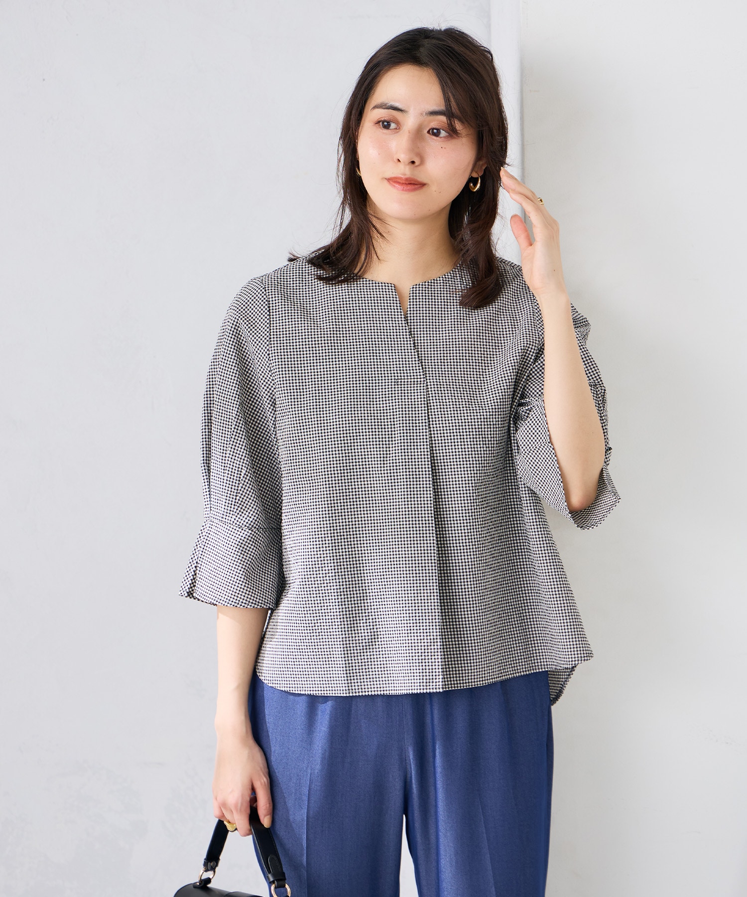 季節の変わり目にちょうど良い五分袖もポイントのブラウスです