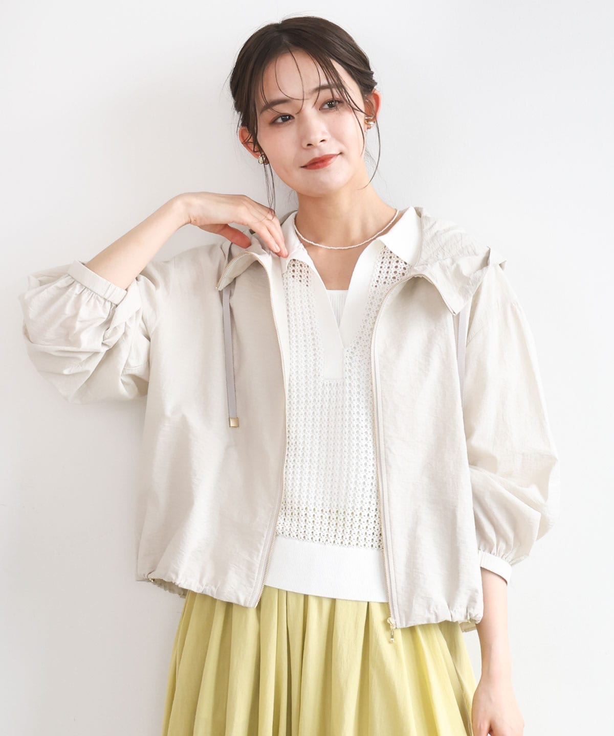 フーデットライトブルゾンはナチュラル見えな素材が大人カジュアルに着こなせるコットンナイロンの素材を使用。ハリ感がありながら、やわらかく肌離れしてくれる空気をはらんだような軽やかさのある素材です。