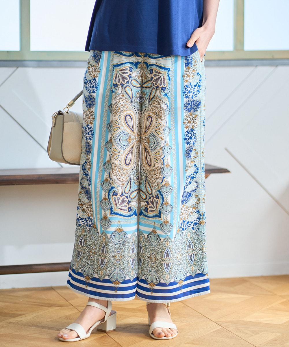 大胆なマリーンブルーの利いたペイズリーパネルプリントが印象なワイドパンツ。