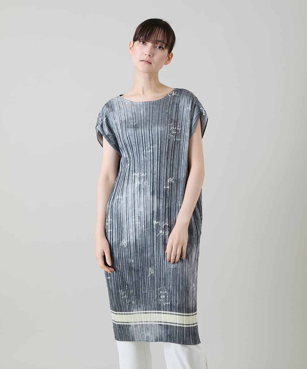 プリントプリーツチュニックは光沢のある生地にデニム柄なグラデーションプリントを施し、ランダムなプリーツで生地に縦長効果と立体感をだした華のあるチュニックワンピース。一枚着でも重ね着でも両方着ていただけるデザインで着丈は90センチ位あるのでレギンス合わせでチュニックワンピースとしてリラクシーにも着ていただけます。発色の良さと裾にラインが入る事で地味にならずカジュアル感が目を惹く大人カジュアルスタイルです。