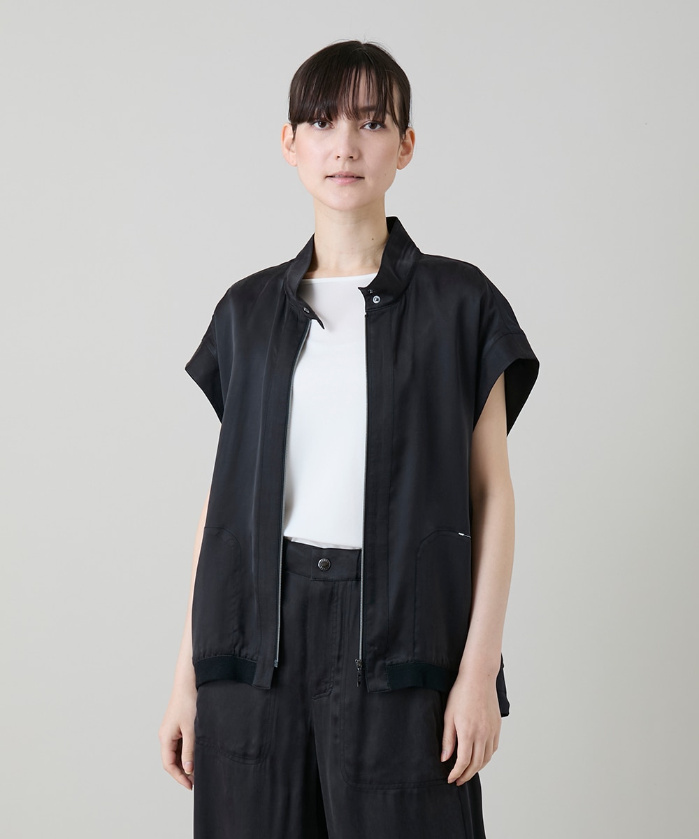 ベストは後ろ身には薄手の柔らかな生地を合わせ、ベストをレイヤードしているようなデザイン。美しい艶感でスポーティーながらも優しいシルエットが品良く印象付けるアイテムです。レイヤード次第でロングシーズン着回しが可能です。