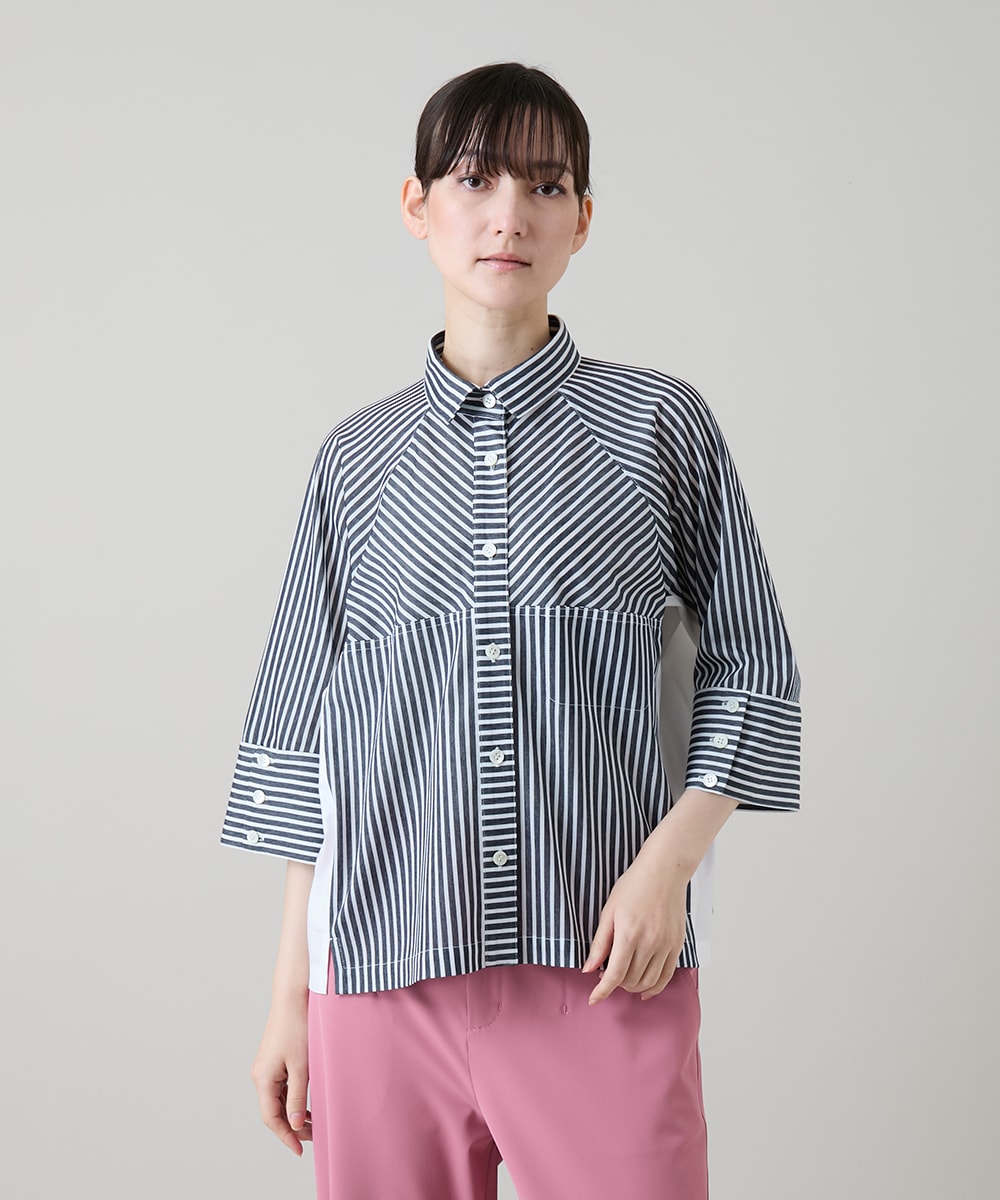 ドライな肌触りで清涼感のあるブラウスは夏にぴったりです。シワになりにくくとても軽量なため、旅行にもぴったりです。ストライプの向きの変化と白無地がジョイントされているので単調な印象にならず、メリハリをプラスします。ゆったりとしたショート丈で夏の羽織アイテムとして活躍します。夏でも気になる肘が隠れる6分袖が嬉しいです。