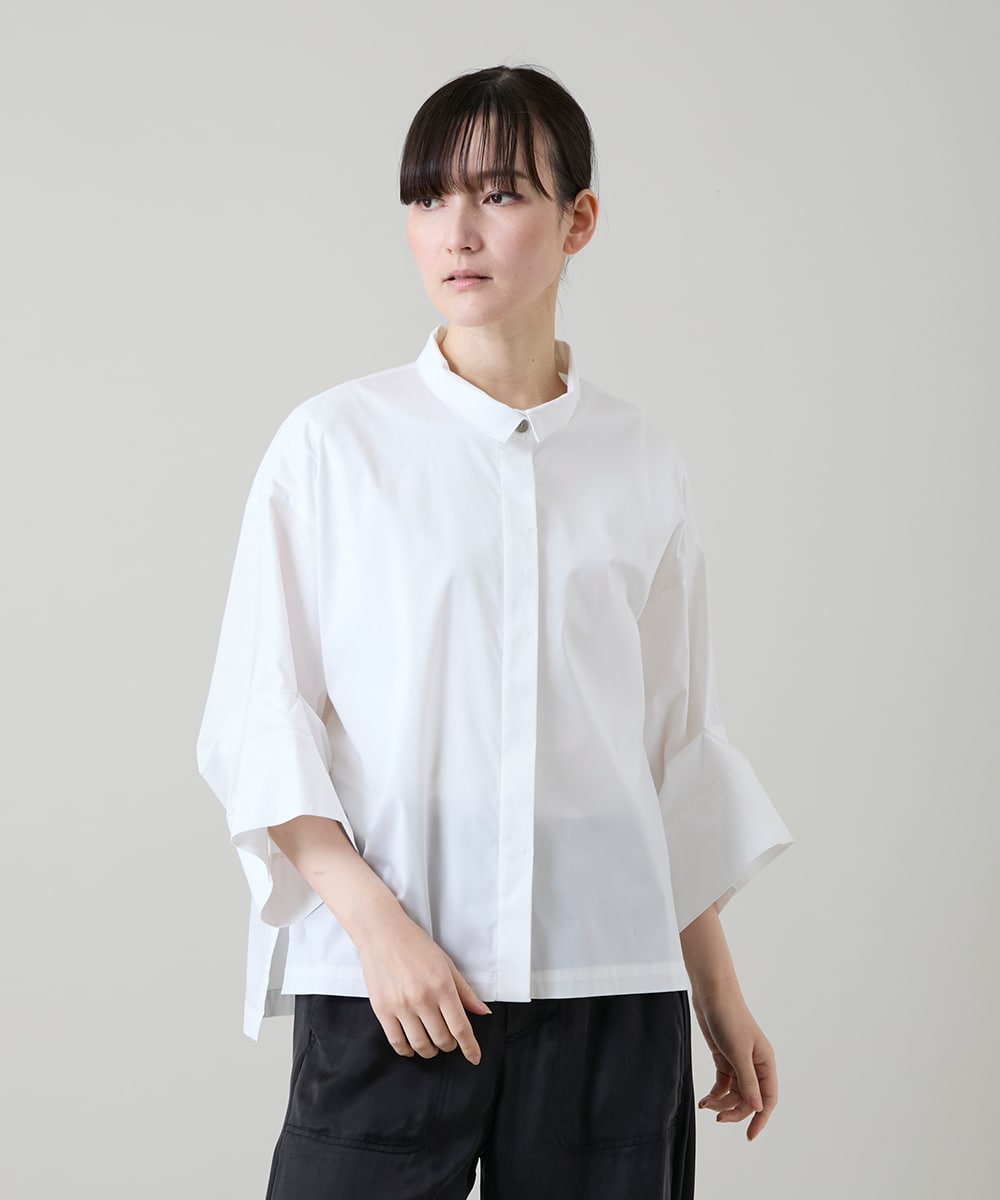 ストレートのボックスボディに袖のタックでカフスをたくし上げたビッグスリーブが目を惹くデザインです。シャツカラーで、すっきりとした比翼仕立てになっており、どんなボトムにも着合わせやすく、一枚着としてはもちろん羽織りとしても活躍する汎用性の高い一品です。