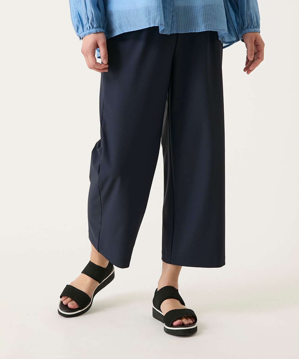 ハイストレッチセミワイドパンツは、洗濯機で手軽に洗えるのに、ハイテンションな伸縮性と程よいゆとりを兼ね備え、すっきりとした