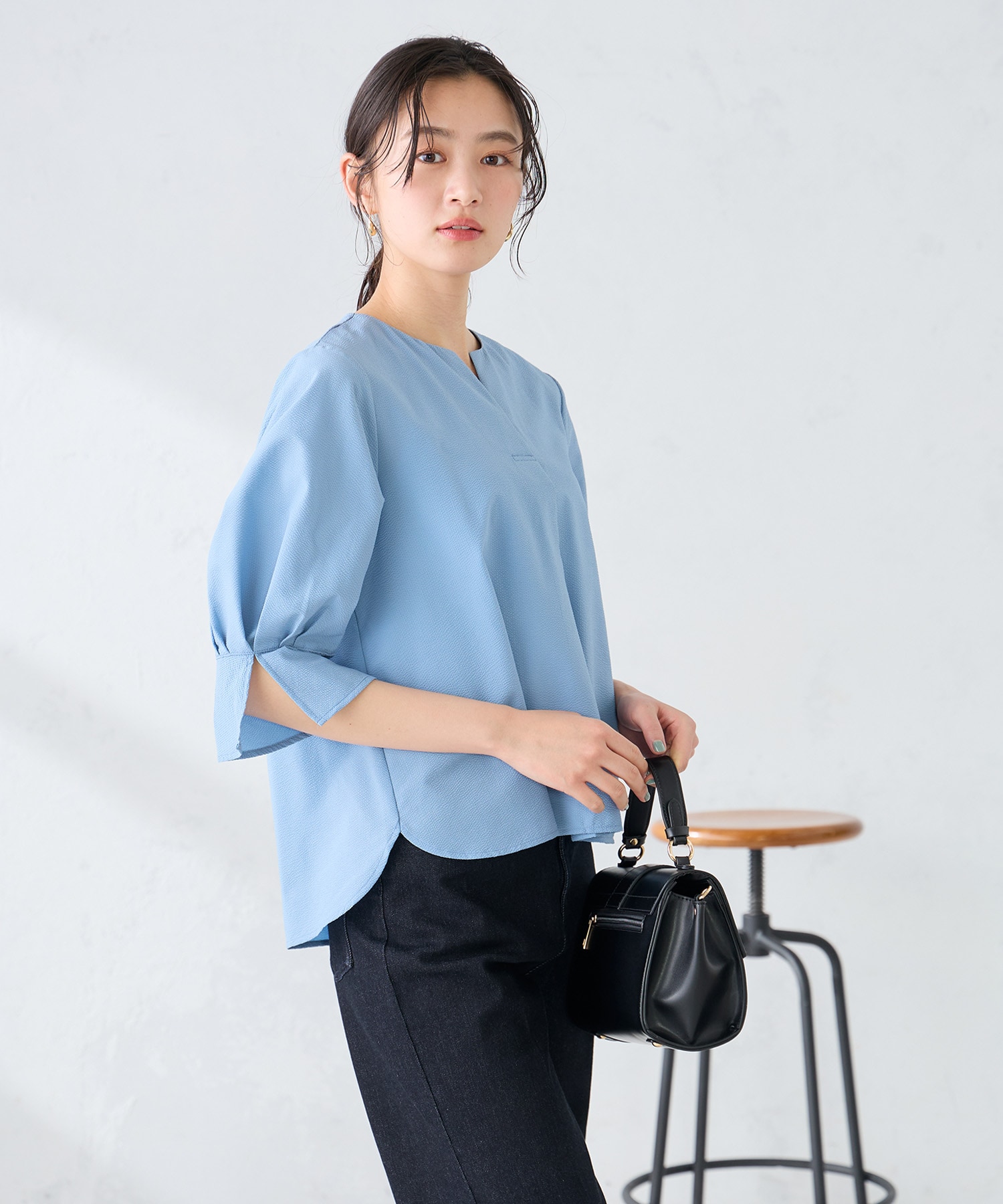 清涼感のあるサッカー素材のブラウスは、軽やかな着心地と抜け感のあるスリットネックデザインで、オフィスや通勤、デートなど幅広いシーンにぴったり。