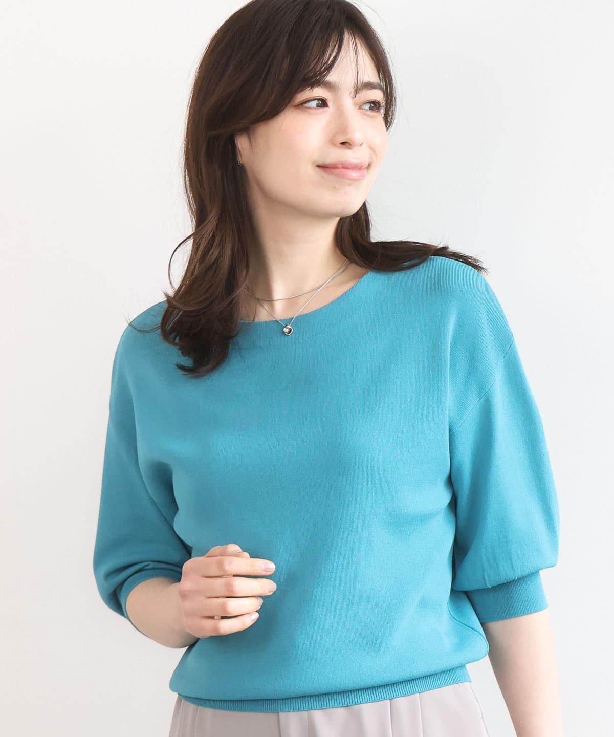 シンプルで着回しやすい、定番の五分袖ニット。