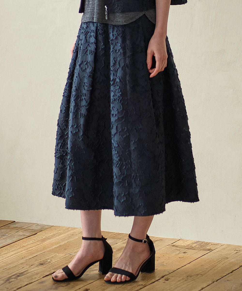 ボリュームのあるタックディテールがラグジュアリーなフレアースカート。ウエストはゴム仕様タイプなので履き心地の良いアイテムです。裾には適度なハリ感とボリュームが出るように仕立てています。きちんと感がありながら上品なシアーで初夏のスタイリングに幅広く活躍してくれる1枚です。