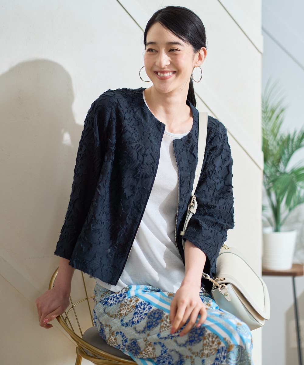 サドルショルダーで着やすいショート丈のフレアーシルエット羽織りジャケットです。軽快なジップアップで軽くさらっと羽織るだけで上品な着こなしが実現します。合わせ方でドレッシーにもカジュアルにも着こなせるアイテム。