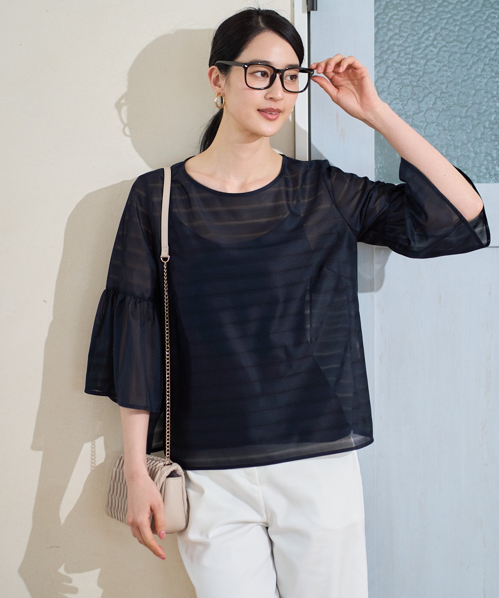 レース編みのような雰囲気のあるシアーボーダートップスです。絶妙なバランスのボートネックが品の良い大人女性にぴったり。袖を肘上で切り替えてストライプ柄にし、ギャザーでボリュームを出した袖コンシャスな1枚です。ドライタッチの独特な風合いに加え、密に編んでも通気性がある編み地に。盛夏に適した爽やかな素材です。