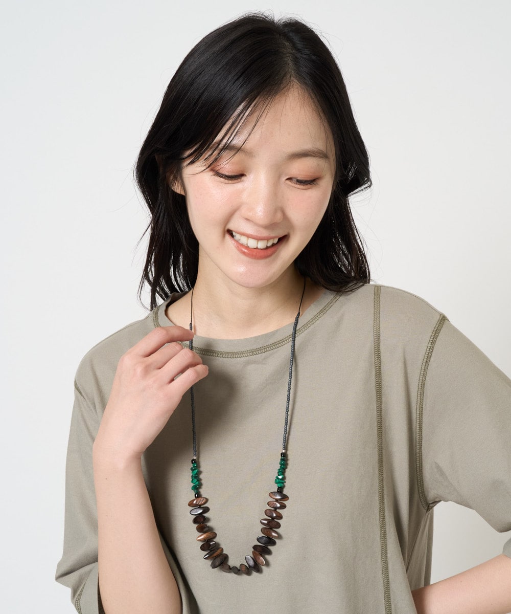 ウッド&ストーンビーズネックレスはナチュラルな風合いと天然石の色合いが魅力で、アジャスター付きで長さ調整も自在です。