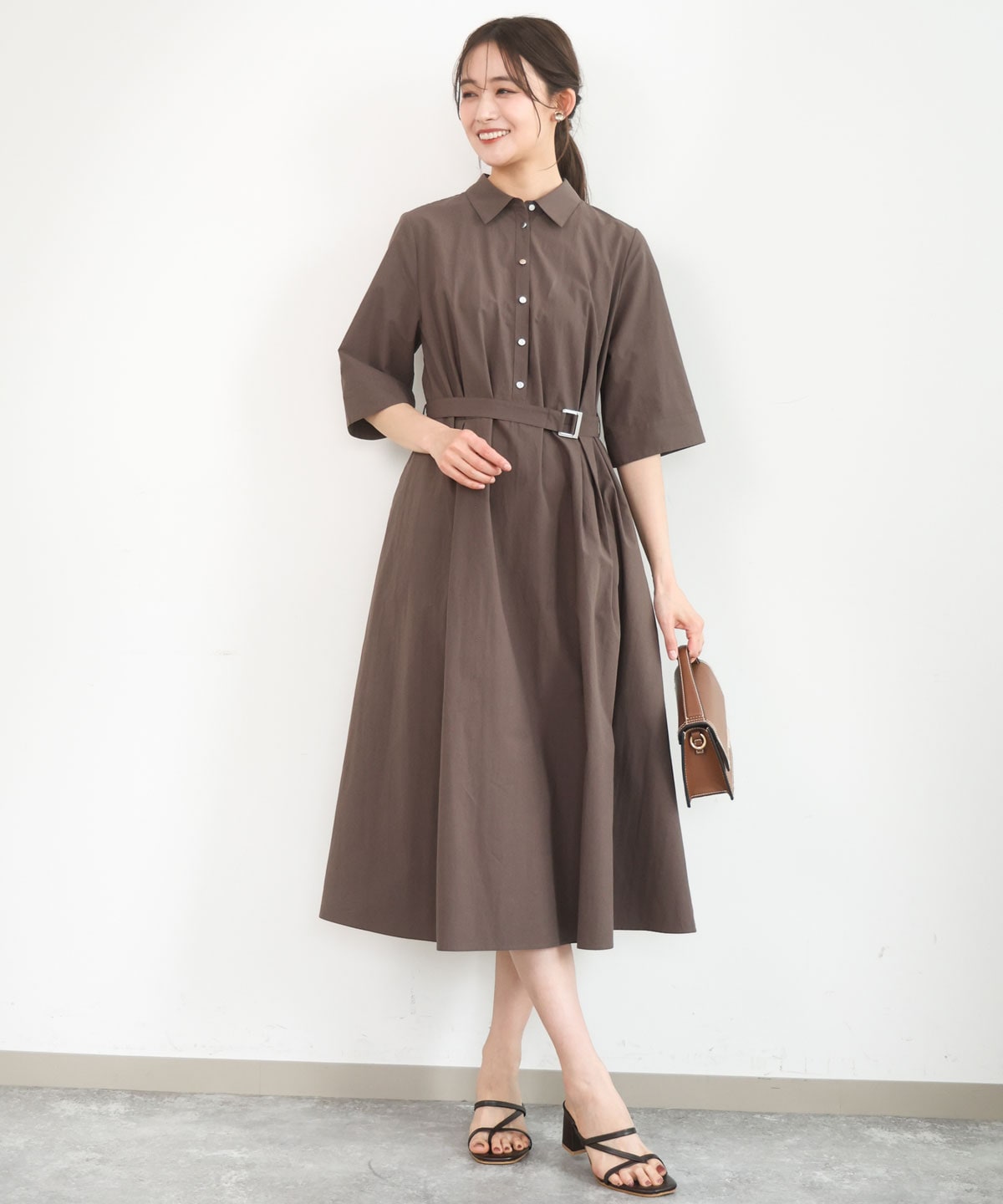 お仕事やお出かけにも便利なシャツワンピース。長めのハーフスリーブが気になる二の腕を隠します。UVカットの嬉しい機能付き、共ベルトでスッキリ見えするのもいいですね。