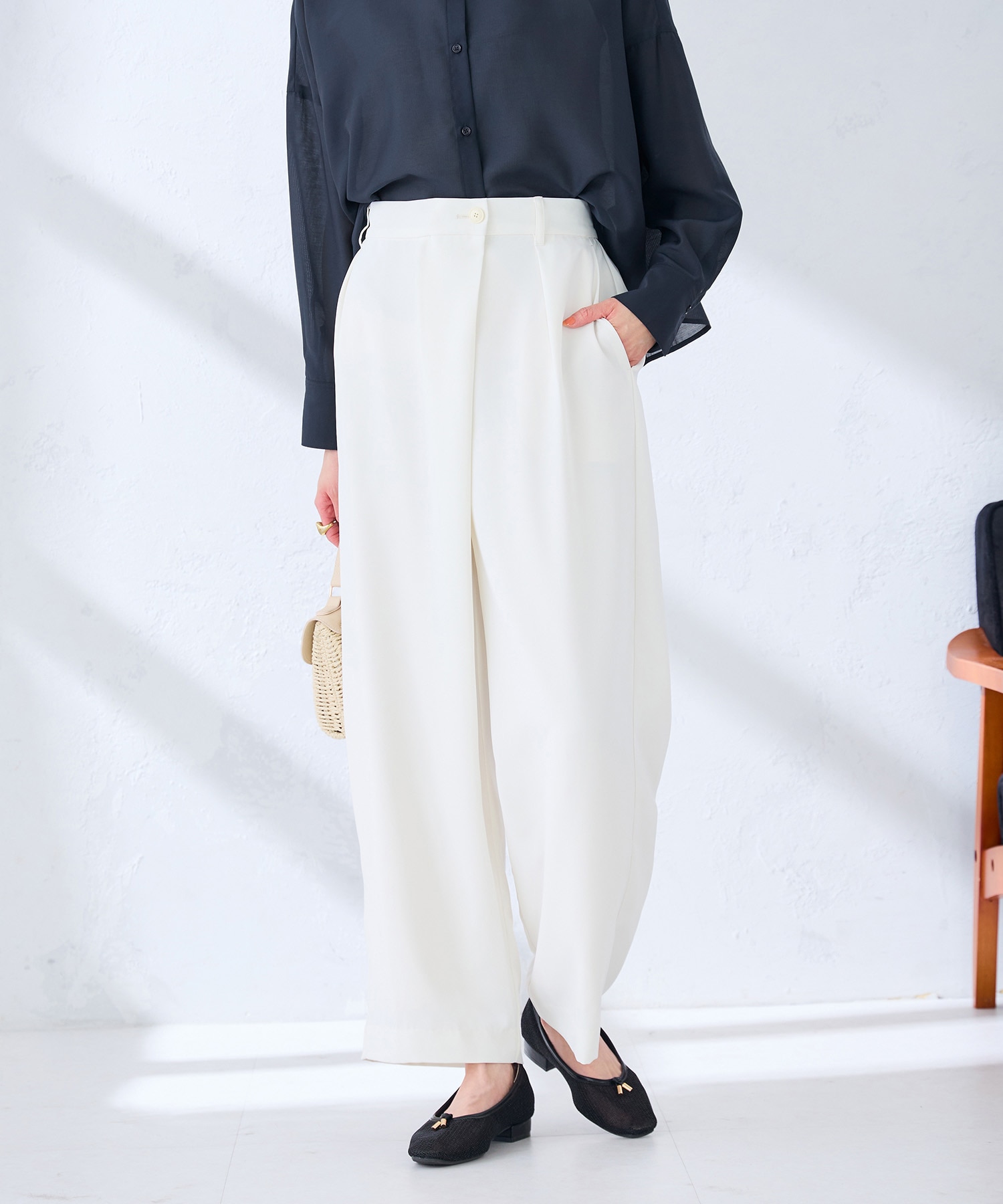アシメデザインで深すぎないタックを施した、きれいめデザインのワイドパンツです!