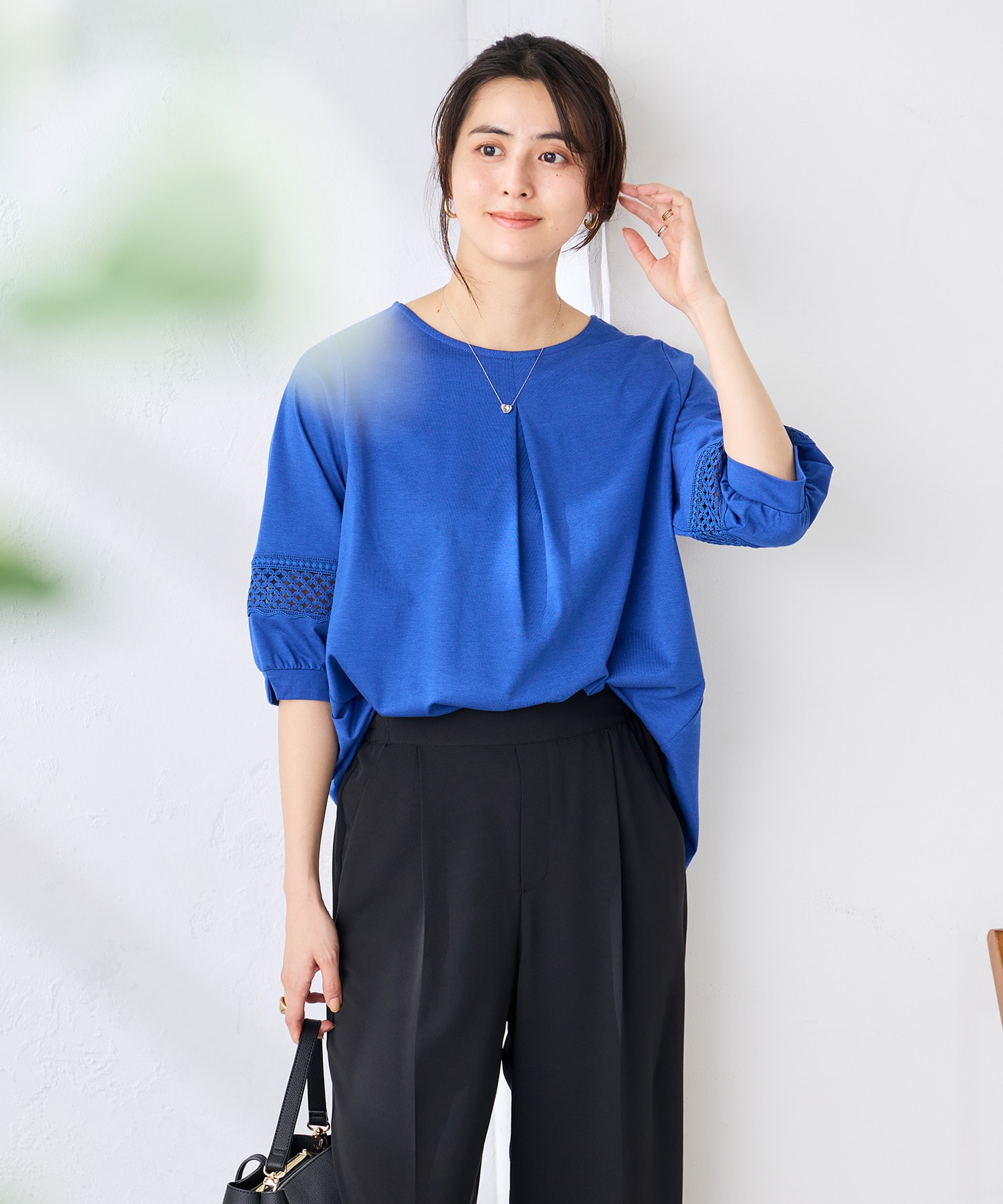 キレイなロイヤルブルーが目を引くレース袖のカットソー。