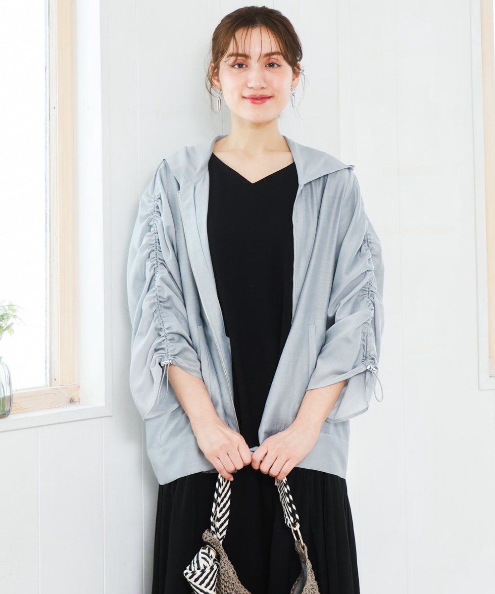 ライトグレー→くすみグリーンにも見えます。ファスナーがシルバーです。