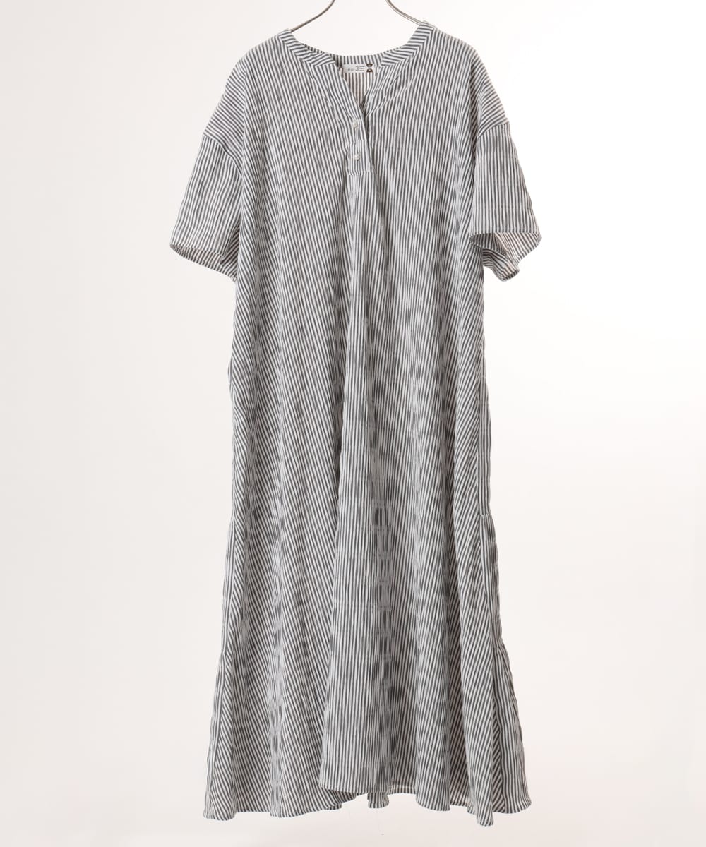 楊柳風の縦シボと、ボーダー状に入ったシャーリングの凹凸が表情豊かなストライプドレス。