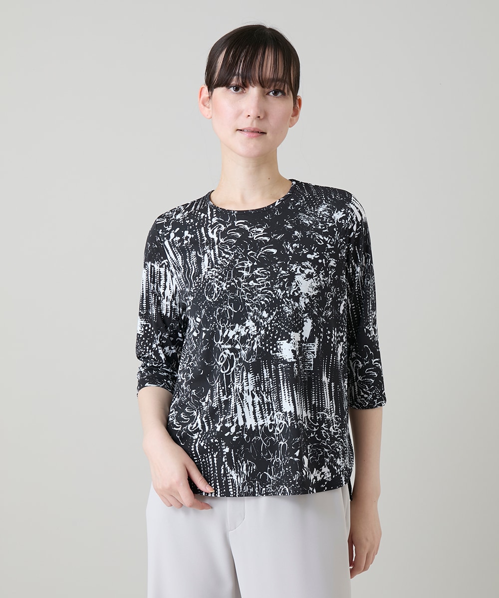 インクペインティングカットソーは、繊細なアート柄と上質素材の組み合わせで、シンプルながら個性的な印象です