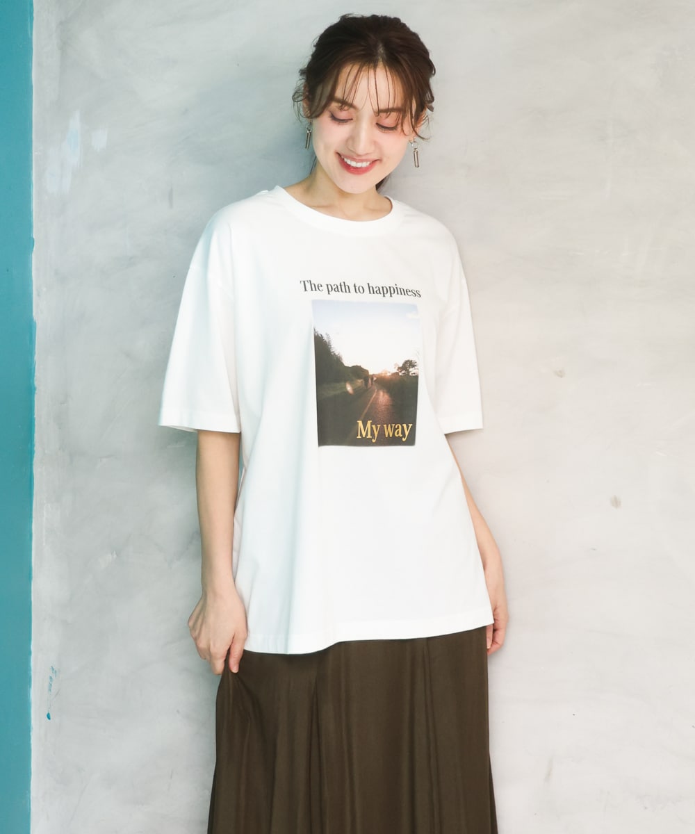 合わせるTシャツは、大人のカジュアルさを演出するフォトプリント入りロゴデザイン。