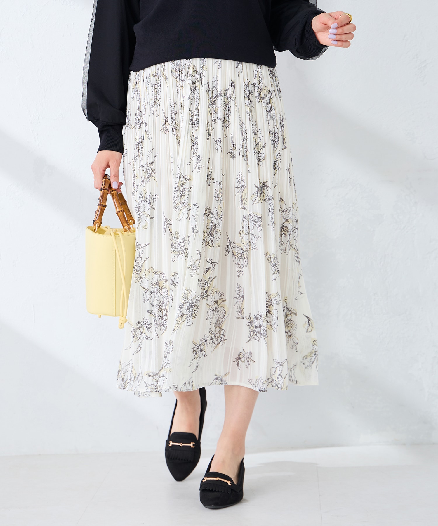 コーディネートした花柄ランダムプリーツスカートは、透け感のある素材で女性らしい軽やかな印象に。
