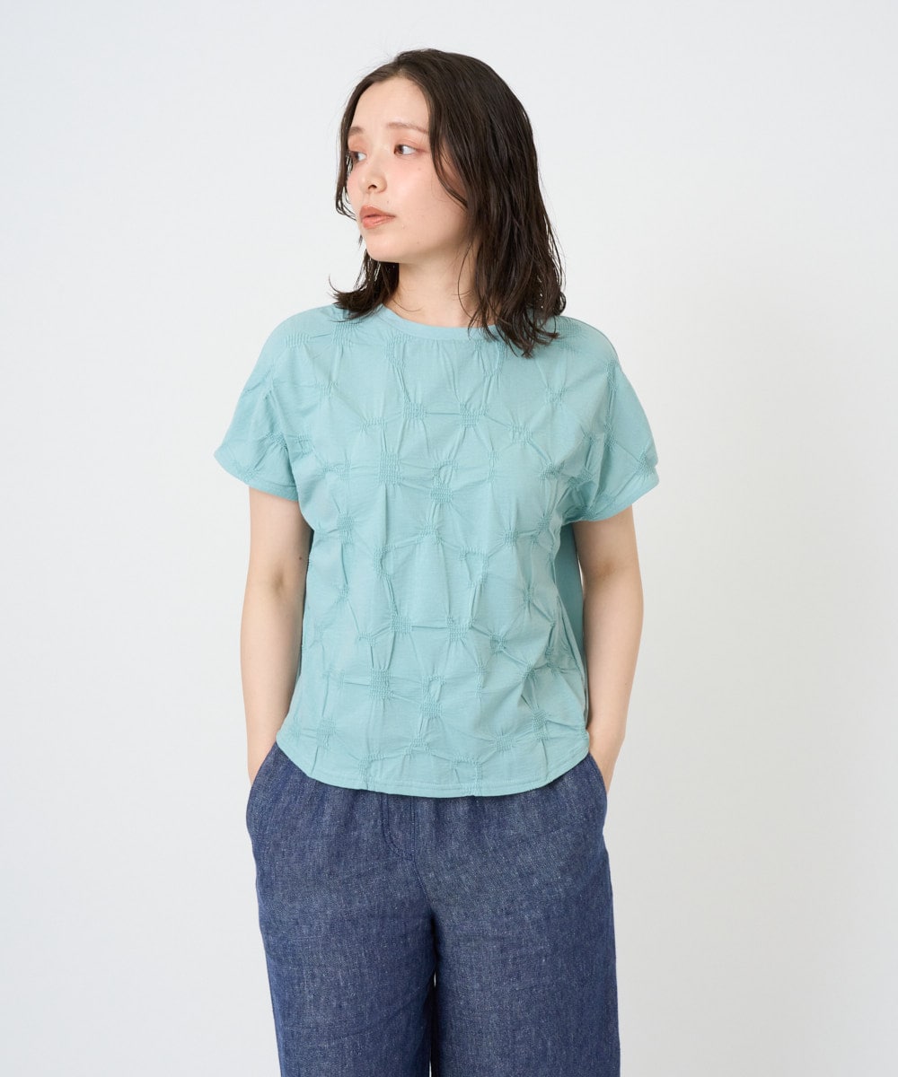 [洗える・日本製]麻混シャーリングフレンチスリーブカットソー