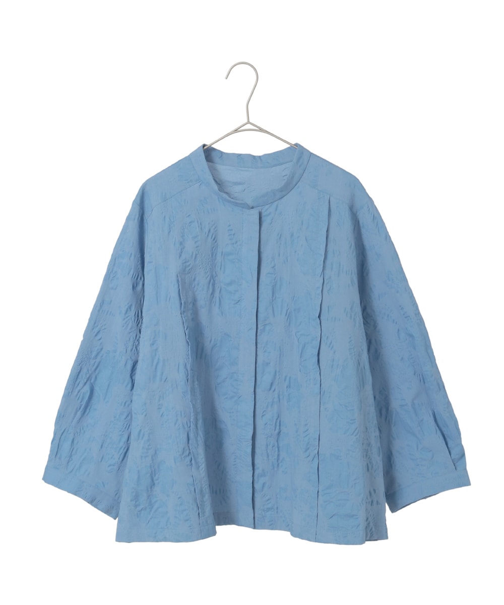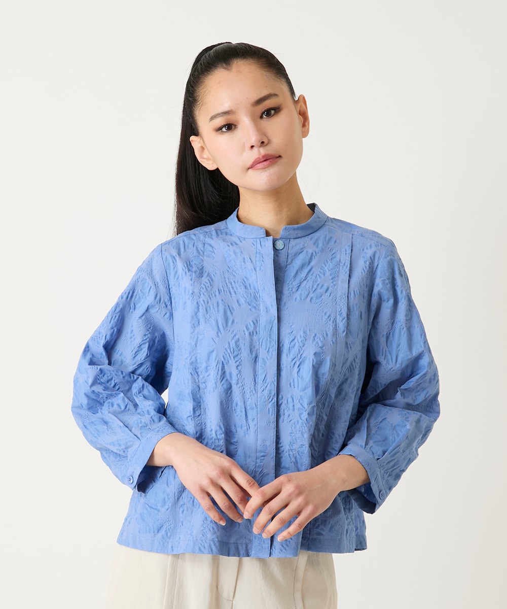 ボタニカルモチーフショートブラウスは、塩縮加工で立体感を持たせたディテールが