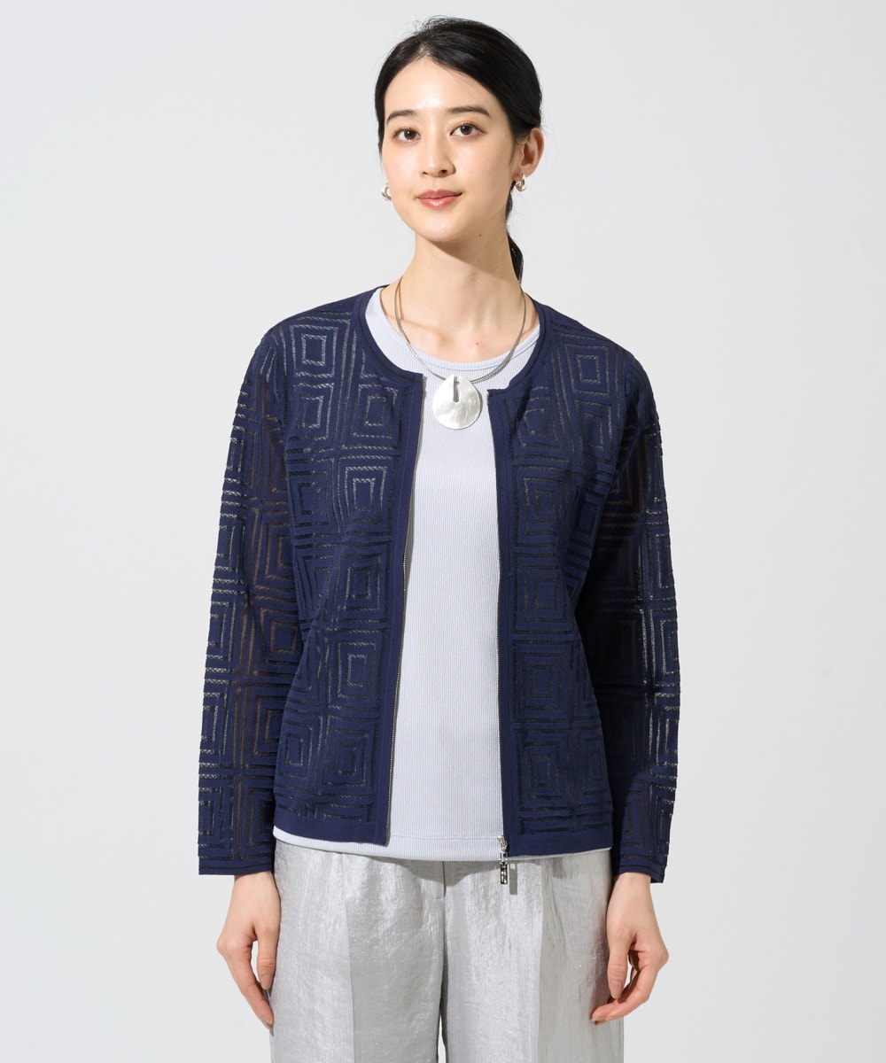 スクエアの柄の透け感がエレガントな羽織りと、少しAラインになっている薄手のカットソーで湿気の多い今からの季節にマストのコーディネートになりました。