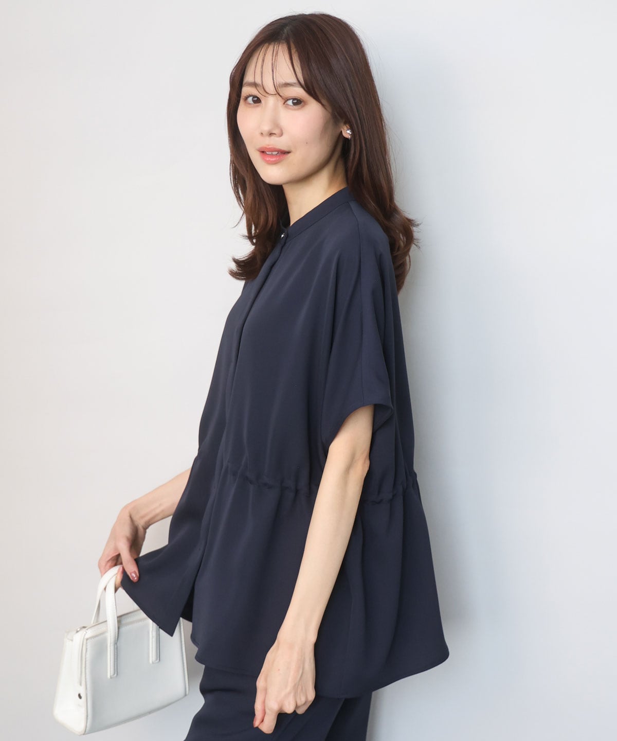 ブラウスはウエストのドローストリングでシルエット調整も自在、腰回りをさりげなくカバーしながら、春夏の陽気に涼しげな着心地を実現。二の腕出ないのも良い!