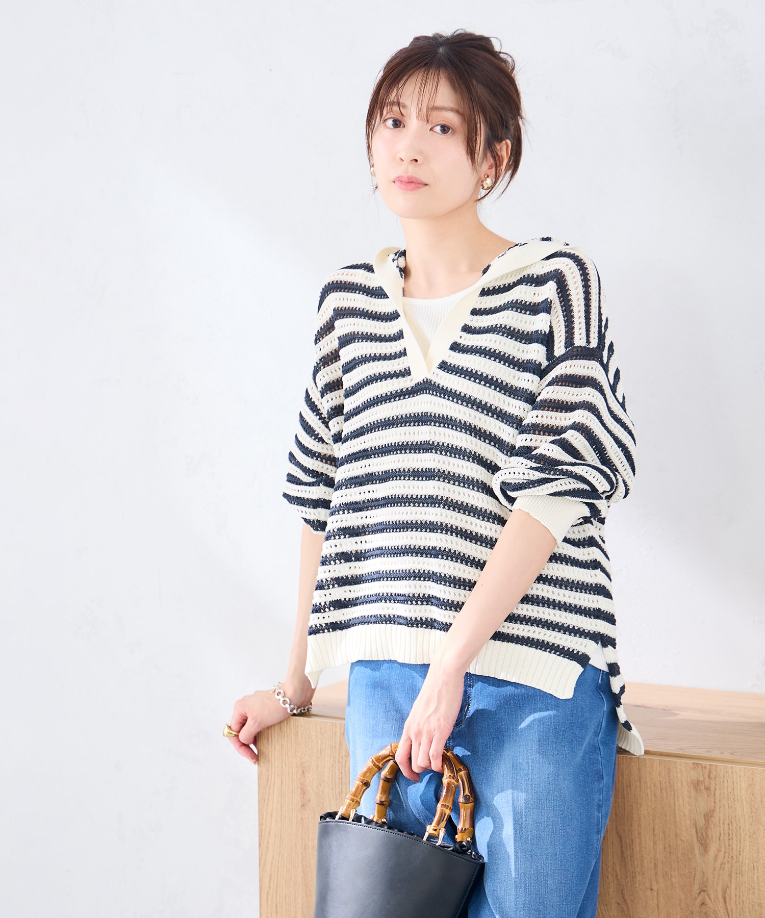 ざっくりとした編地が軽やかな印象のフード付きニット