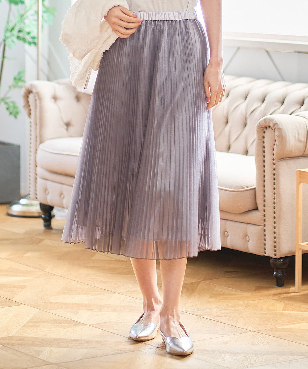 ジャンニロのフラワー刺繍カットソーとさりげない光沢感とサラッとした風合いが特徴的なブライトオーガンジープリーツスカートです。