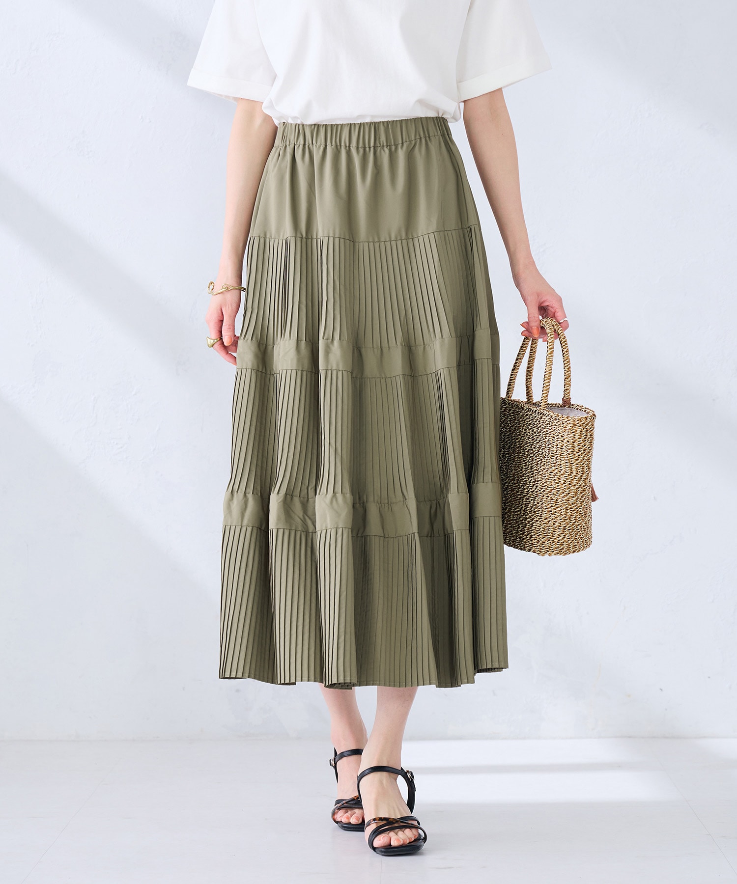 カーキが新鮮でとても軽い素材、女性らしいプリーツシルエットのスカートです。