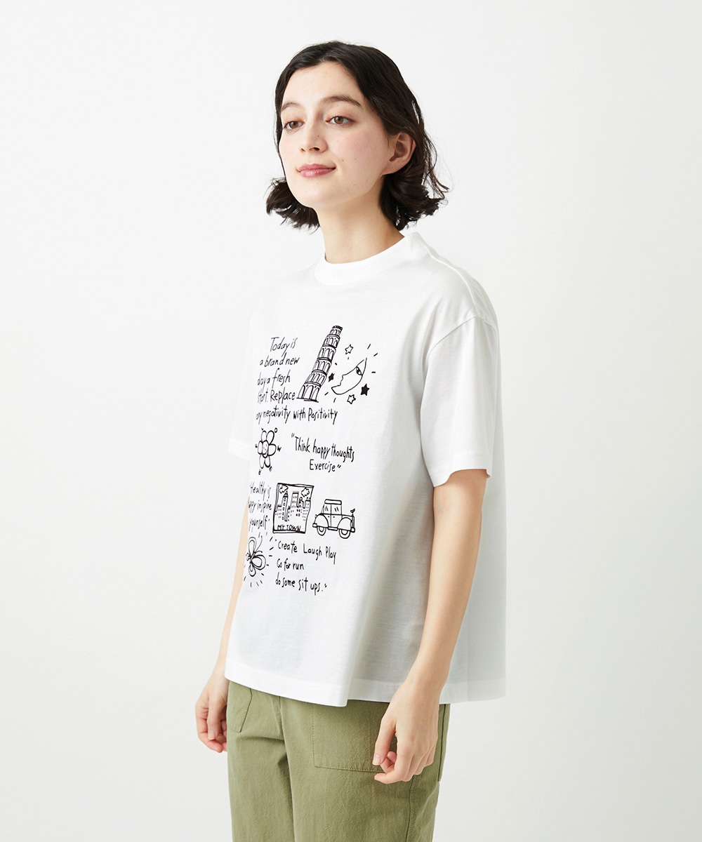 トップスのカットソーは、立体感のあるフロッキープリントとシルケット仕上げで上品さをプラス。